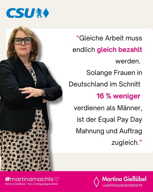 „Gleiche Arbeit muss endlich gleich bezahlt werden. Solange Frauen in Deutschland 16 Prozent weniger verdienen als Männer, ist der Equal Pay Day Mahnung und Auftrag zugleich. Es geht nicht um Symbolpolitik, sondern um Respekt, Fairness und die Anerkennung der Lebensleistung von Frauen.“
